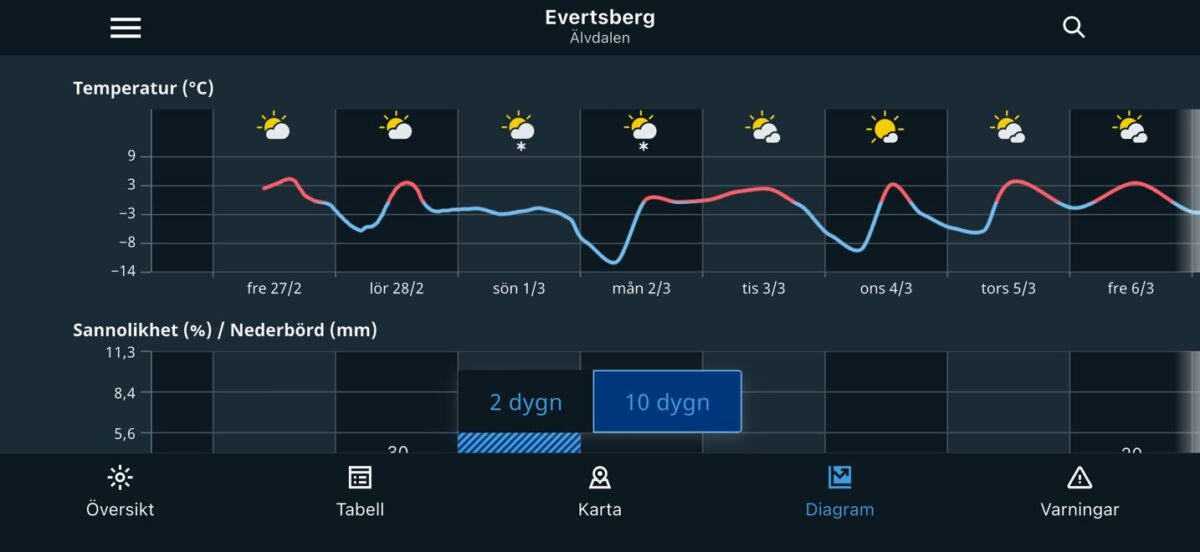 - Snötemperatur: ca -3 – 0 (baserad väderprognoser 27 februari – 1 mars).